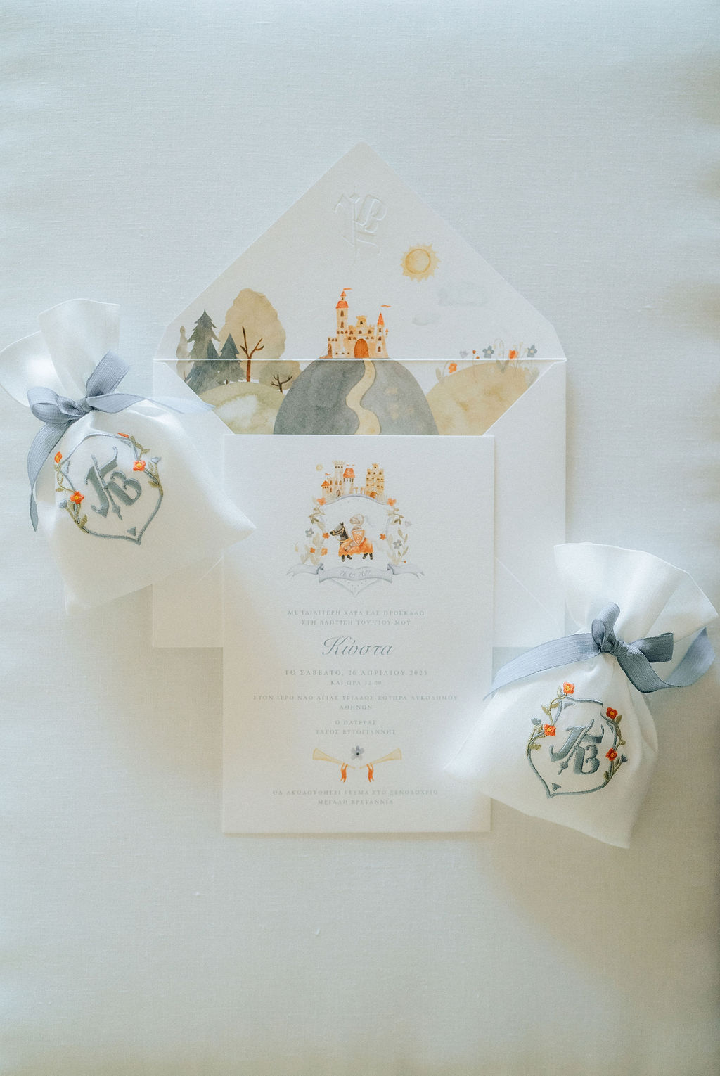 A beautifully crafted stationery suite inspired by a classic knights theme sets the tone for this little boy’s christening. The invitation features soft, charming details that evoke a fairytale world of courage and kindness. Each piece is paired with a fine linen pouch, lovingly handmade and embroidered with his initials — a timeless keepsake that feels both personal and elegant. The result is a thoughtful blend of tradition, imagination, and heartfelt craftsmanship.